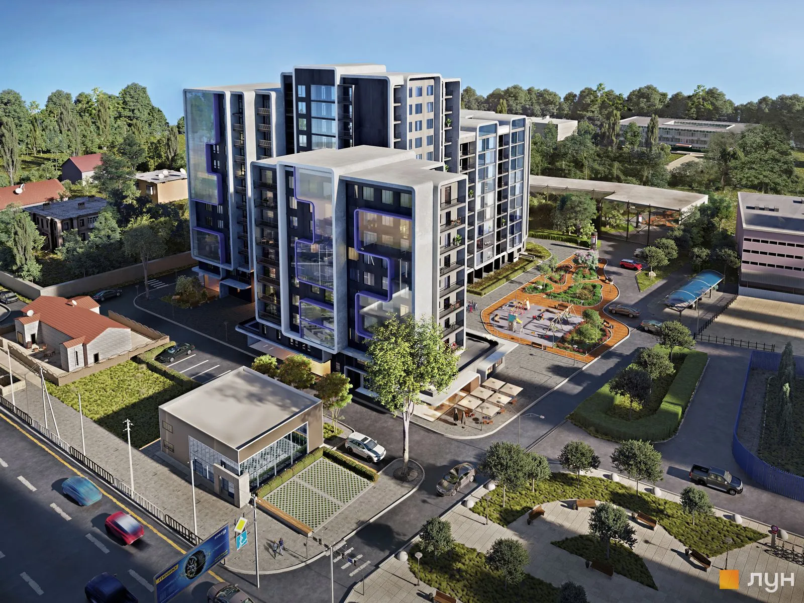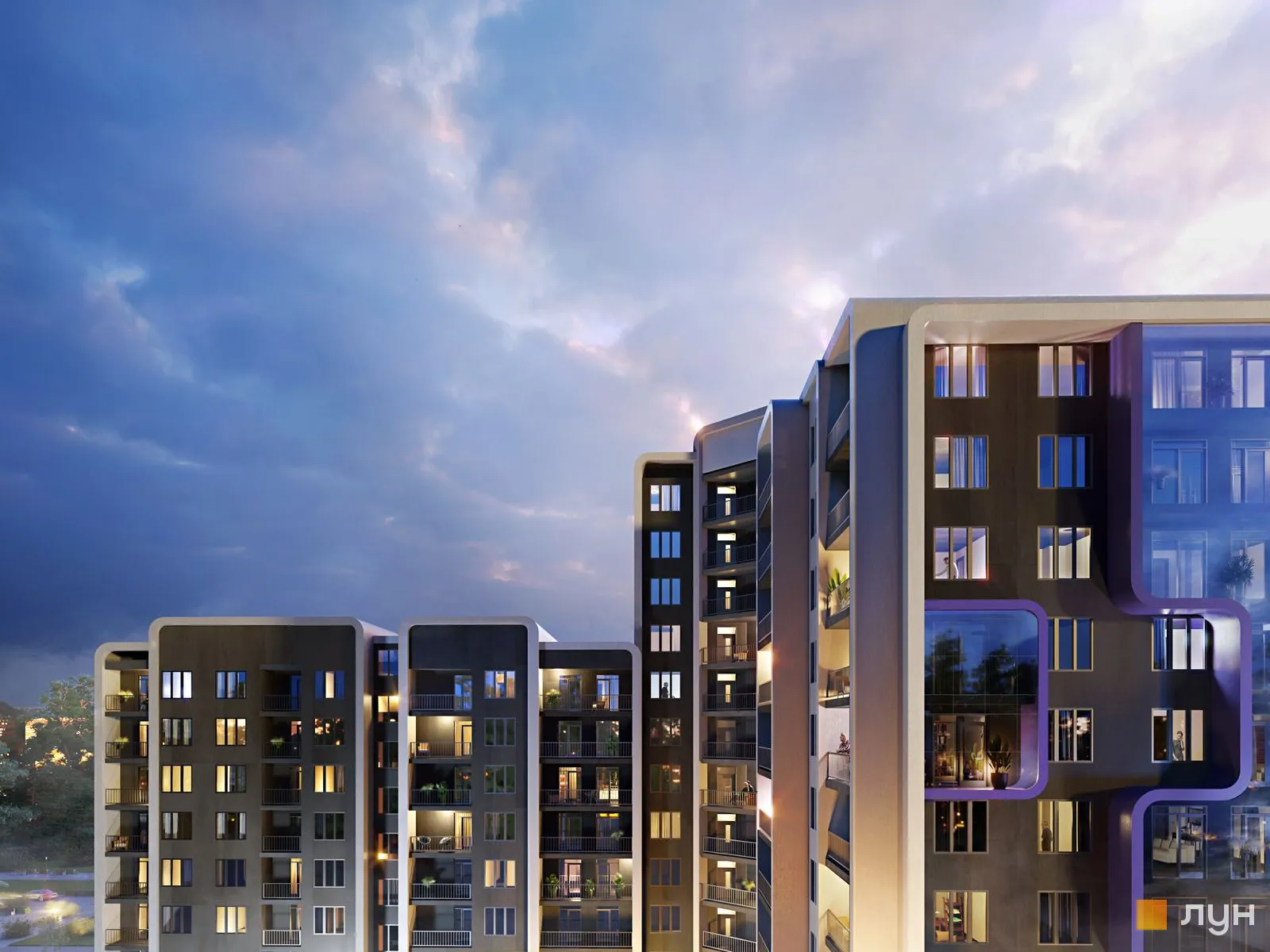 Впізнаваність комплексу надає оздоблення: стіни з панорамних вікон, закруглені кути фасадів, перепади висоти секцій з 14 до 10 поверхів. На прибудинковій території будуть місця для відпочинку, дитячий та спортивний майданчики, окремий багаторівневий паркінг.
